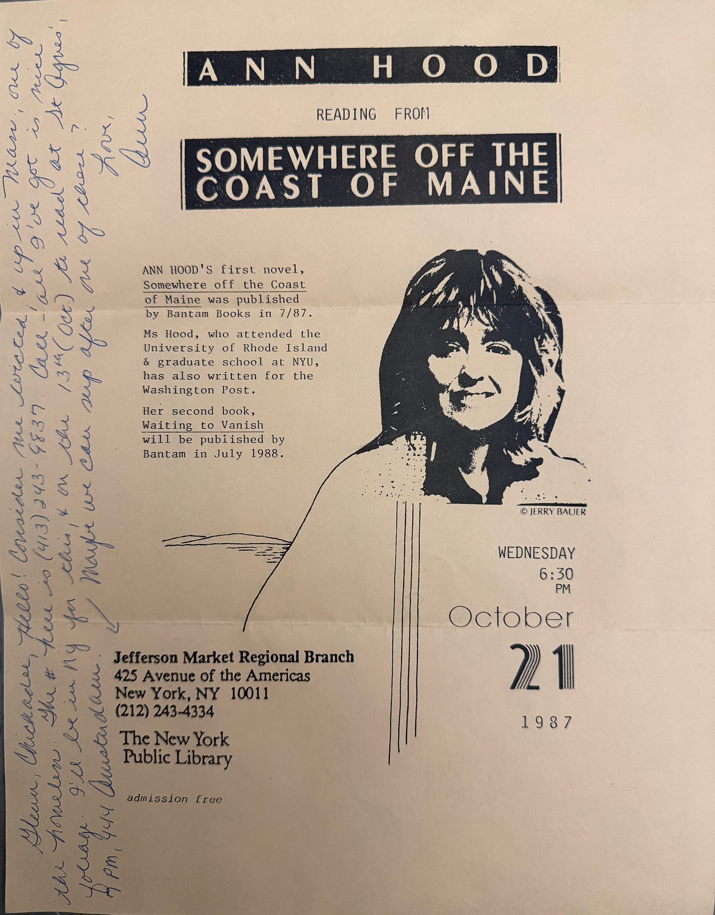 The first page of my first novel, Somewhere Off the Coast of Maine, mostly written on a beat up oak table in my apartment on Bleecker Street.