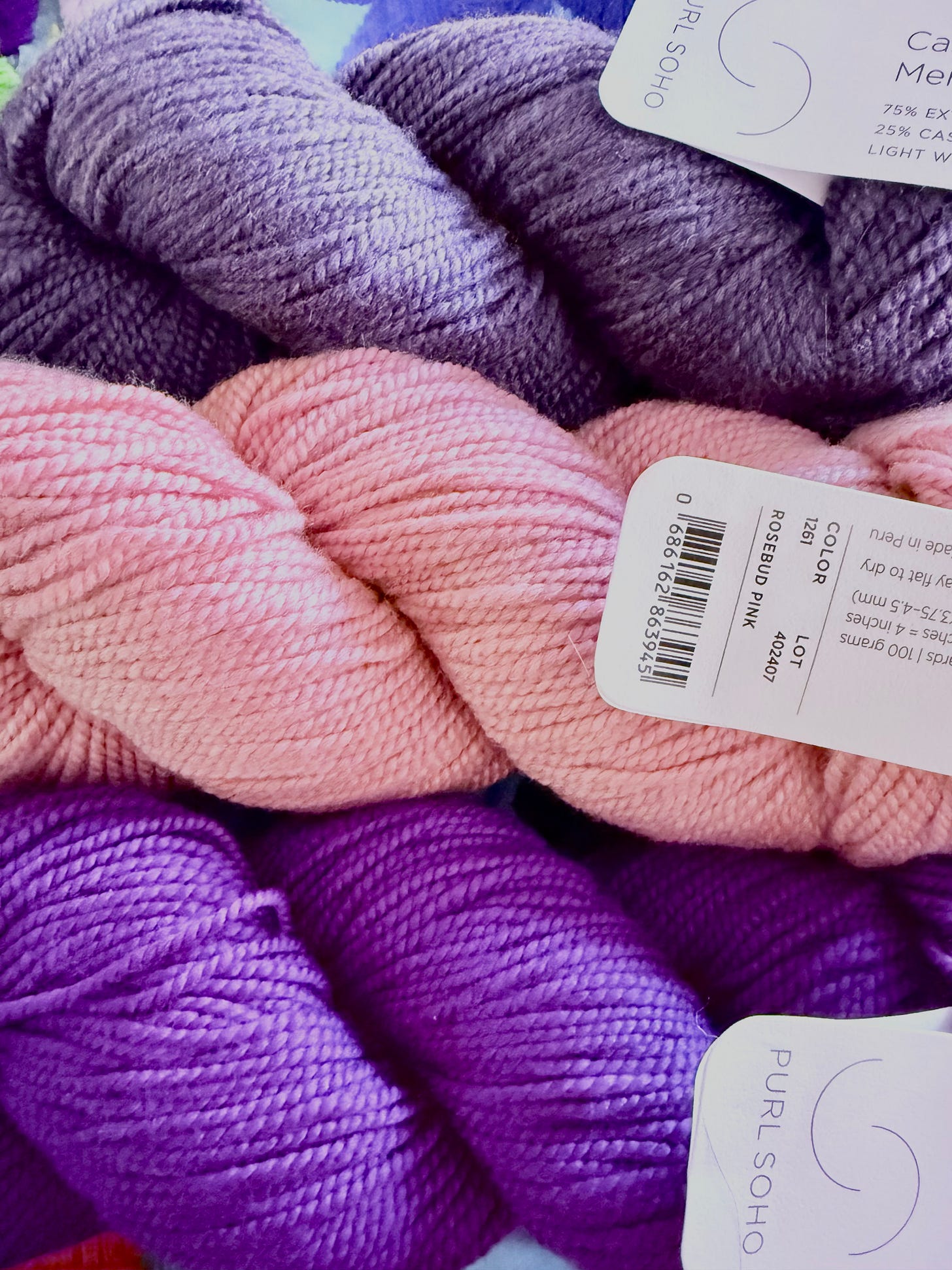 I just bought yarn for three more: Bright Iris, Rosebud Pink, and Deep Pansy.